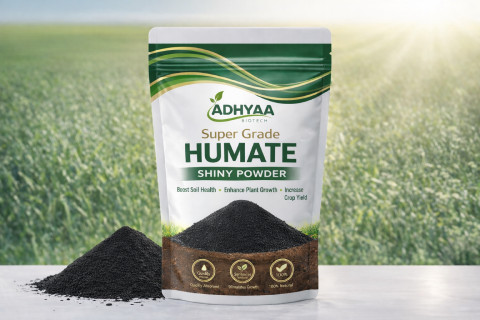 Super Grade Humate Shiny Powder from Adhyaa Biotech is a high-purity, finely processed humic acid product designed for rapid absorption and high efficiency in plant nutrition. Its ultra-fine particle size ensures quick solubility and faster availability of nutrients, making it ideal for modern agricultural practices.